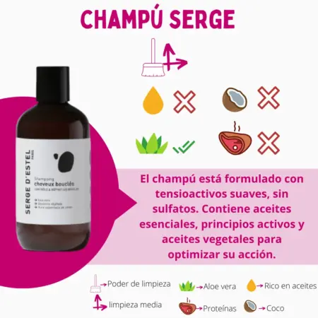 El champú para cabello rizado está formulado con tensioactivos suaves, sin sulfatos. Se combinan aceites esenciales, principios activos y aceites vegetales para optimizar su acción. También lo hemos formulado para que no apelmace el cabello.