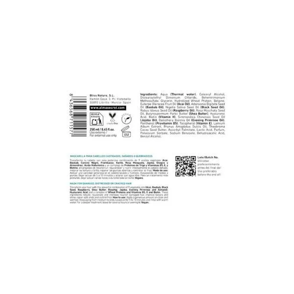 Alma Secret Extreme Repair Mask 250ml es una mascarilla que ayuda a reparar el cabello de agentes dañinos. Transforma tu cabello con esta poderosa combinación de 9 aceites vegetales (Acai, Baobab, Comino Negro, Frambuesa, Karité, Rosa Mosqueta, Jojoba, Onagra y Almendras), Ácido Hialurónico y un complejo de Proteínas de Trigo y Vitaminas B5, E, y Biotina.