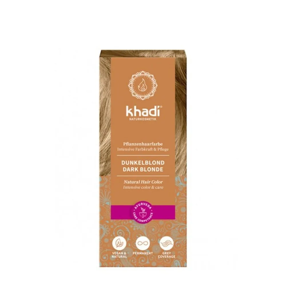 Tinte Natural Khadi Rubio Oscuro Ceniza es un tinte vegetal 100% natural que proporciona un rubio oscuro ceniza mate, ideal para cabello claro o oscuro. Su fórmula ayurvédica con granada, nuez negra y aloe vera hidrata, fortalece y aporta un color duradero, brillo y suavidad. Sin amoníaco, parabenos, peróxidos ni colorantes artificiales, es 100% vegano y respetuoso con tu cabello.