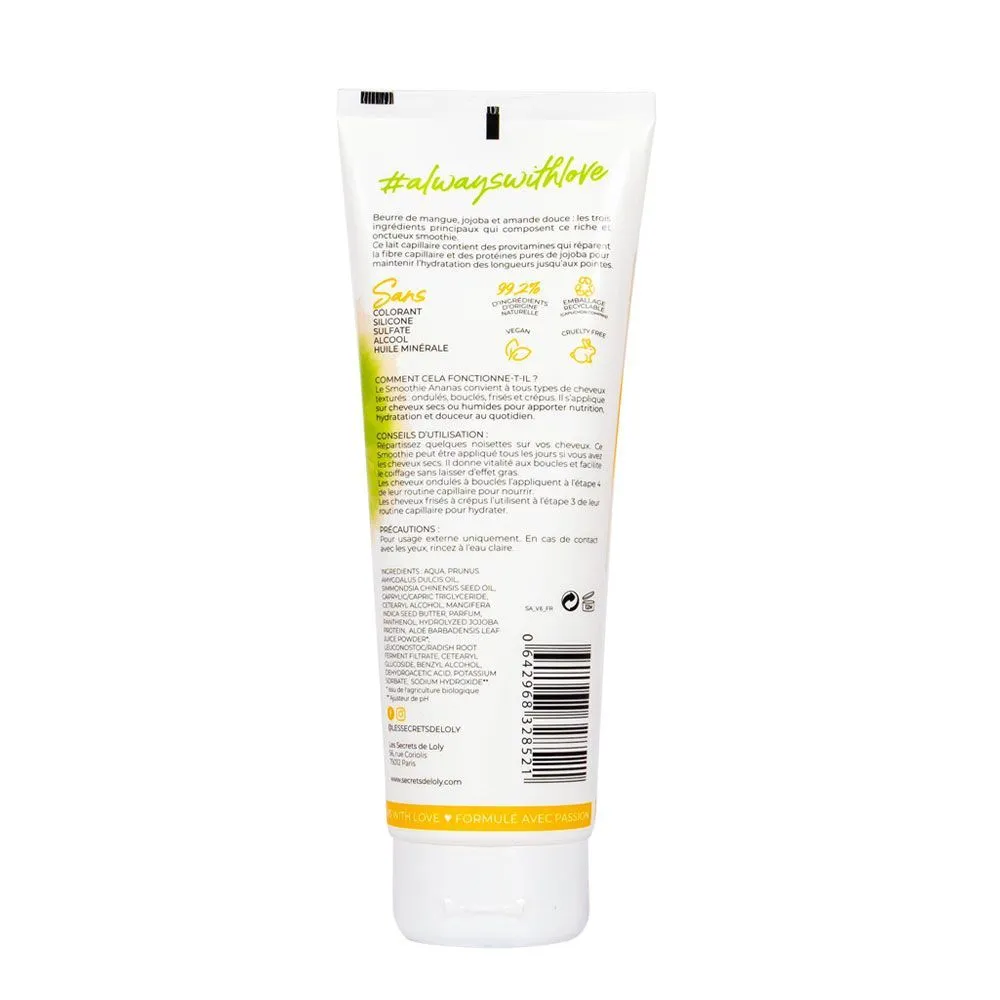 Mantequilla de mango, jojoba y almendra dulce: los tres ingredientes principales que componen este rico y cremoso batido. Esta leche capilar contiene provitaminas que reparan la fibra capilar y proteínas puras de jojoba para mantener la hidratación desde los largos hasta las puntas. El Smoothie de Piña es adecuado para todo tipo de cabello texturizado: ondulado, rizado, rizado y crespo. Se aplica sobre el cabello seco o húmedo para aportar nutrición, hidratación y suavidad a diario.